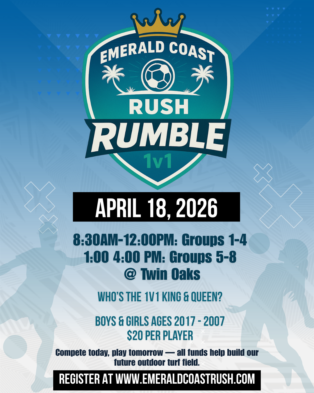Coastal Clash! Coastal Rush Families, Our June Interclub Playdate Happens tomorrow. This event is for 2014s - 2019s ages. Being held at Ashton Brosnaham, it is the perfect opportunity to play and then walk over to the stadium for Pensacola 1559’s double header games. Both games are free for all players! Please fill out the form below so we can mark you down and then we will look forward to seeing you soon! Spots are filling up fast, and registration closes today at 1pm. Spots are filling up fast, and registration closes today at 1pm.
